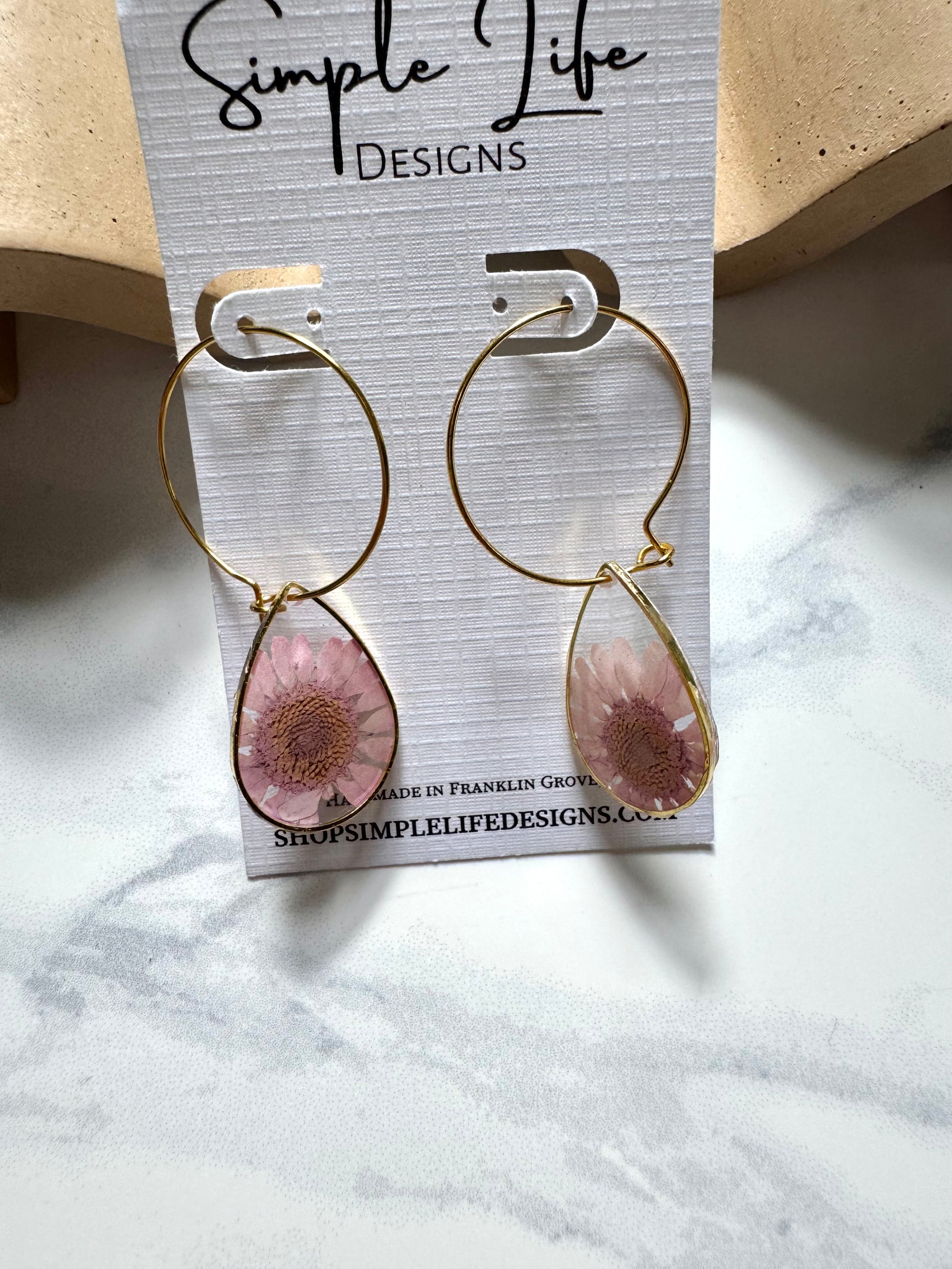 Made from real dried flowers. Please note the color may fade over time. Color will fade much quicker if stored in direct sunlight. If stored out of the light, the color should last. Please keep in mind that these earrings are handmade and there may be slight variations from the picture. No two earrings will be exactly alike.